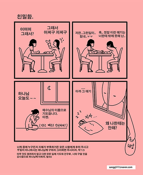 우상지 작가 작품활동 응원하기!지난 20년간 갓피플 만화는 주보 사용을 무료로 제공해왔습니다. 이제는 작가들에게 작은 정성을 표현하면 어떨까요? 주보 1회 사용시 1,000원의 자발적 결제 후 이용해주세요주보사용 자발적 결제1,000원작가에게 커피 한잔선물하기좋아요아멘개척교회 돕기 2016-09-27 · 9201 · 107 · 2내가 그 안에_우상지더보기발맞춤너의 의미주님 안에