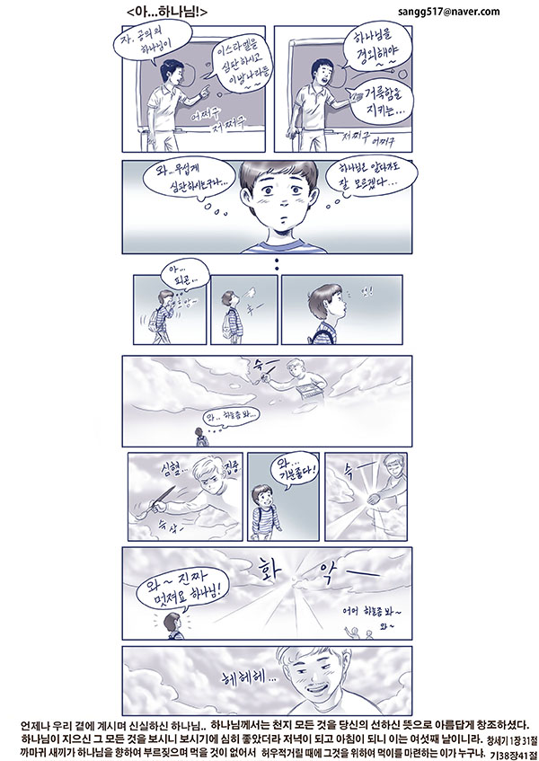 하나님이 보시기에 좋았더라. 우상지 작가 작품활동 응원하기!지난 20년간 갓피플 만화는 주보 사용을 무료로 제공해왔습니다. 이제는 작가들에게 작은 정성을 표현하면 어떨까요? 주보 1회 사용시 1,000원의 자발적 결제 후 이용해주세요주보사용 자발적 결제1,000원작가에게 커피 한잔선물하기좋아요아멘개척교회 돕기 2016-09-29 · 7123 · 106 · 2내가 그 안에_우상지더보기발맞춤너의 의미주님 안에