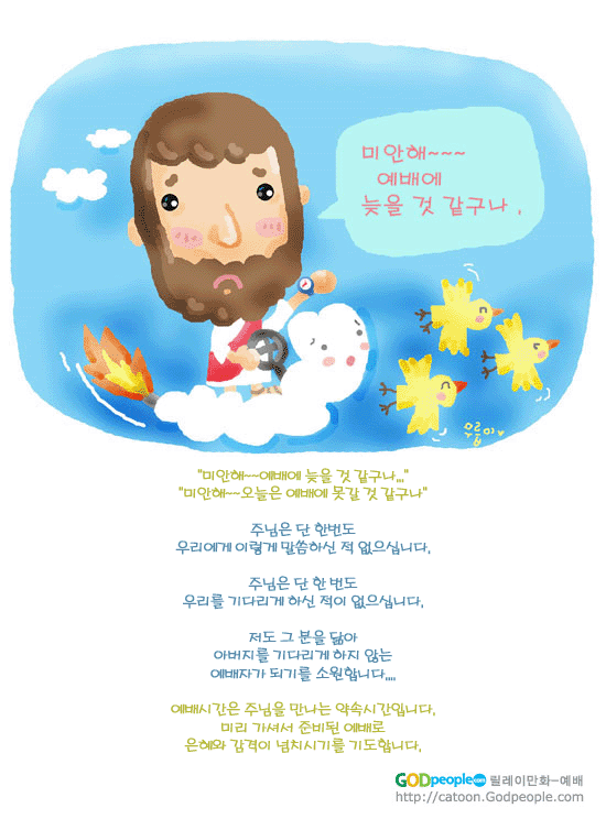 임선경의 무릅이네 전체보기>> 임선경 작가 작품활동 응원하기!지난 20년간 갓피플 만화는 주보 사용을 무료로 제공해왔습니다. 이제는 작가들에게 작은 정성을 표현하면 어떨까요? 주보 1회 사용시 1,000원의 자발적 결제 후 이용해주세요주보사용 자발적 결제1,000원작가에게 커피 한잔선물하기좋아요아멘개척교회 돕기 2005-05-29 · 15221 · 107 · 1지각무릎이네_임선경더보기행복한 자리내 안에 사시는 주님...행복한 나귀새끼