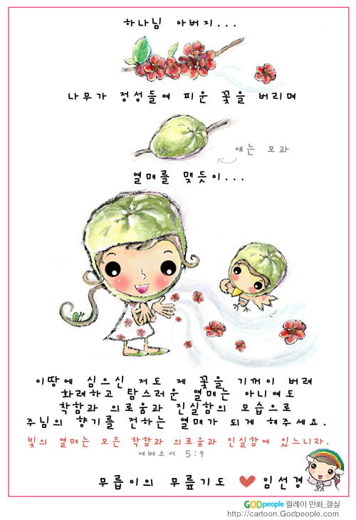 임선경의 무릅이네 전체보기>> 임선경 작가 작품활동 응원하기!지난 20년간 갓피플 만화는 주보 사용을 무료로 제공해왔습니다. 이제는 작가들에게 작은 정성을 표현하면 어떨까요? 주보 1회 사용시 1,000원의 자발적 결제 후 이용해주세요주보사용 자발적 결제1,000원작가에게 커피 한잔선물하기좋아요아멘개척교회 돕기 2006-10-18 · 8093 · 106 · 향기무릎이네_임선경더보기행복한 자리내 안에 사시는 주님...행복한 나귀새끼