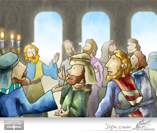 성령님께서 강림하시고 제자들은 각각 다른 방언으로 말하기 시작했습니다.