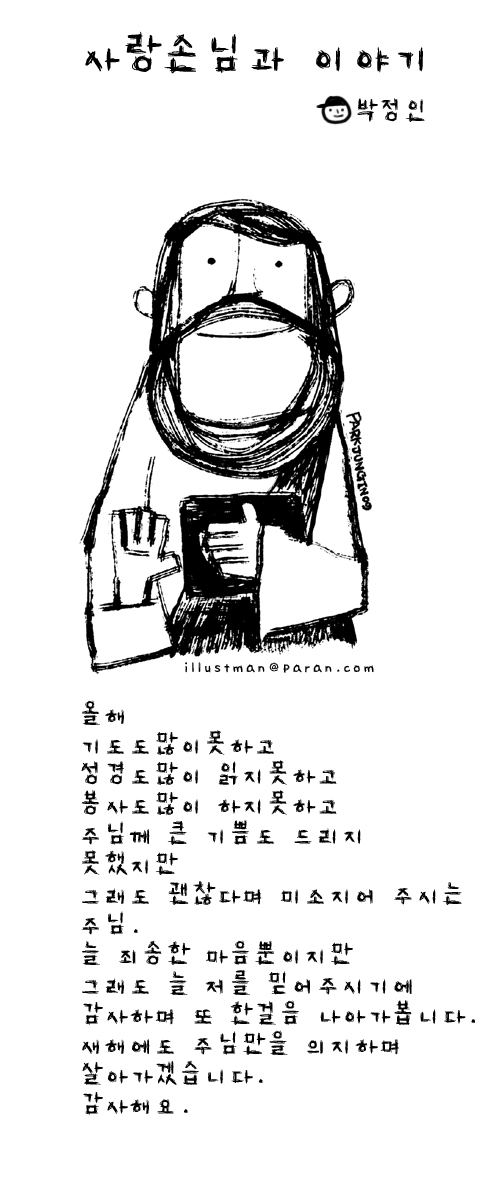 박정인 작가 작품활동 응원하기!지난 20년간 갓피플 만화는 주보 사용을 무료로 제공해왔습니다. 이제는 작가들에게 작은 정성을 표현하면 어떨까요? 주보 1회 사용시 1,000원의 자발적 결제 후 이용해주세요주보사용 자발적 결제1,000원작가에게 커피 한잔선물하기좋아요아멘개척교회 돕기 2009-12-26 · 14916 · 22 · 1감사절사랑손님과 이야기_박정인더보기승리하는 한해가 되게 하소서감사해요 주님.예수님이 늘 미소지으실수 있도록