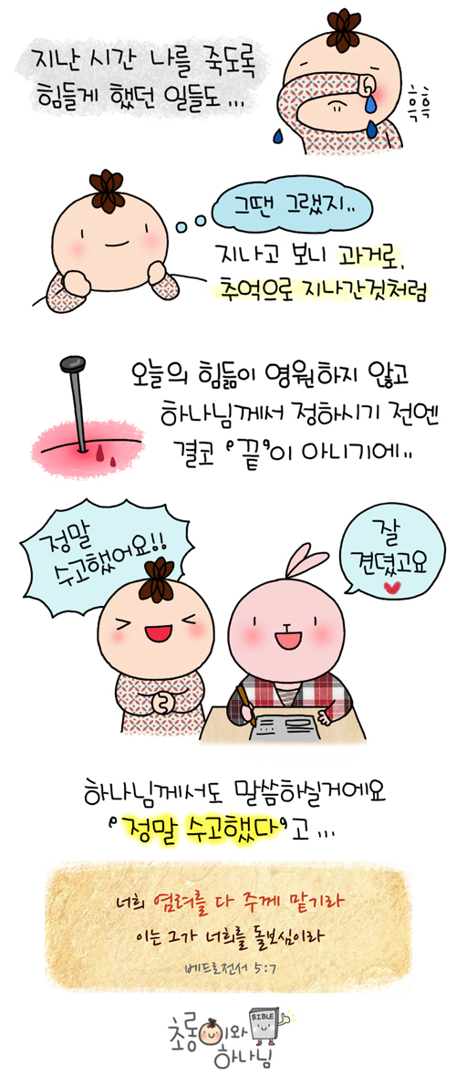 초롱이와하나님 작가가 만드는 기독교 굿즈! 네이버 스마트스토어에서 만나보세요? 초롱이네 문방구 https://smartstore.naver.com/chorongandjesus 김초롱 작가 작품활동 응원하기!지난 20년간 갓피플 만화는 주보 사용을 무료로 제공해왔습니다. 이제는 작가들에게 작은 정성을 표현하면 어떨까요? 주보 1회 사용시 1,000원의 자발적 결제 후 이용해주세요주보사용 자발적 결제1,000원작가에게 커피 한잔선물하기좋아요아멘개척교회 돕기 2013-11-08 · 8831 · 22 · 2하나님뜻초롱이와 하나님_김초롱더보기하나님께 말씀드려 :)자유케하셨네!순종