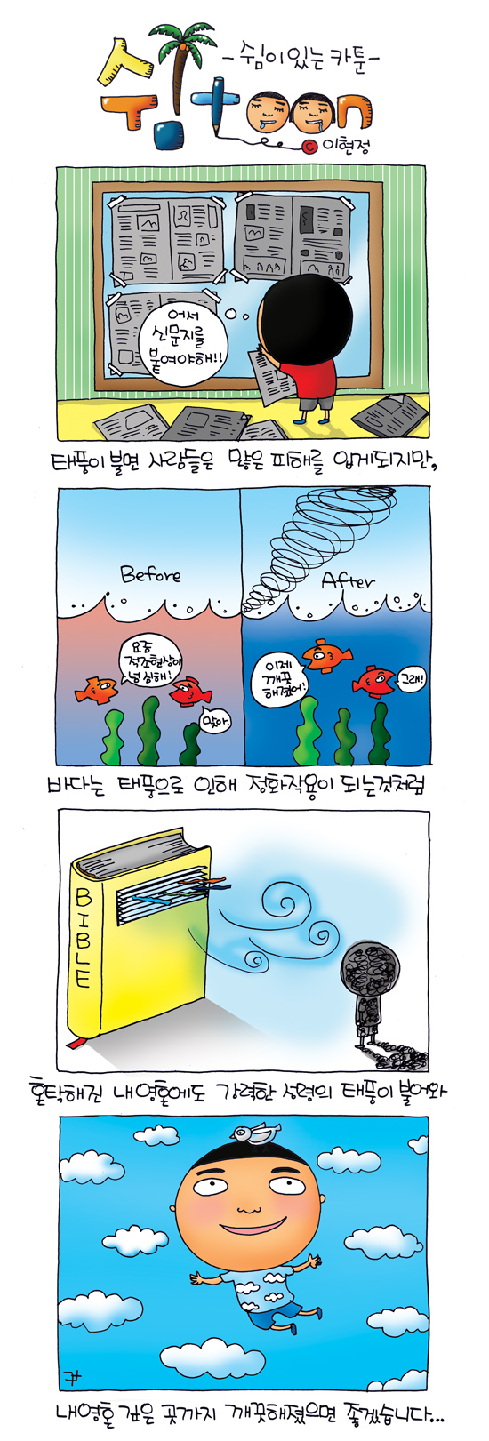 이현정 작가 작품활동 응원하기!지난 20년간 갓피플 만화는 주보 사용을 무료로 제공해왔습니다. 이제는 작가들에게 작은 정성을 표현하면 어떨까요? 주보 1회 사용시 1,000원의 자발적 결제 후 이용해주세요주보사용 자발적 결제1,000원작가에게 커피 한잔선물하기좋아요아멘개척교회 돕기 2012-08-31 · 2288 · 23 · 1태풍쉼 툰_이현정더보기볼륨을 높여요.다시 불지펴야죠...가장 따뜻한 성탄선물...