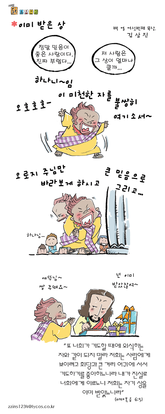 김상진 작가 작품활동 응원하기!지난 20년간 갓피플 만화는 주보 사용을 무료로 제공해왔습니다. 이제는 작가들에게 작은 정성을 표현하면 어떨까요? 주보 1회 사용시 1,000원의 자발적 결제 후 이용해주세요주보사용 자발적 결제1,000원작가에게 커피 한잔선물하기좋아요아멘개척교회 돕기 2005-07-07 · 5571 · 22 · 외식닭 울음소리_김상진더보기성경여행-6편빚과 몫길