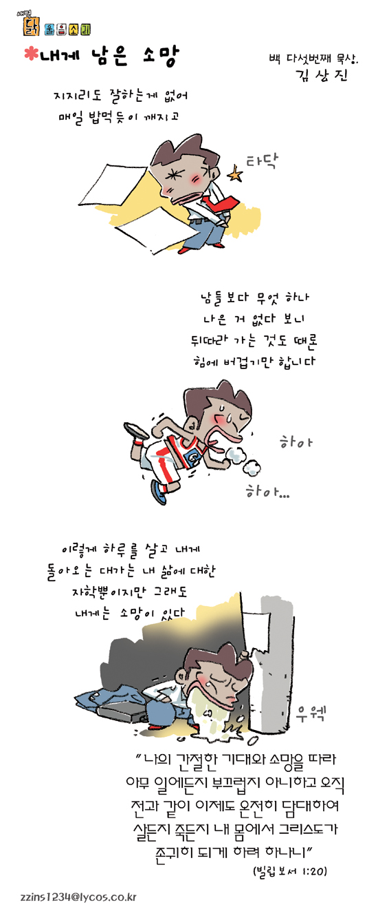 김상진 작가 작품활동 응원하기!지난 20년간 갓피플 만화는 주보 사용을 무료로 제공해왔습니다. 이제는 작가들에게 작은 정성을 표현하면 어떨까요? 주보 1회 사용시 1,000원의 자발적 결제 후 이용해주세요주보사용 자발적 결제1,000원작가에게 커피 한잔선물하기좋아요아멘개척교회 돕기 2005-06-08 · 4893 · 22 · 존귀닭 울음소리_김상진더보기성경여행-6편빚과 몫길