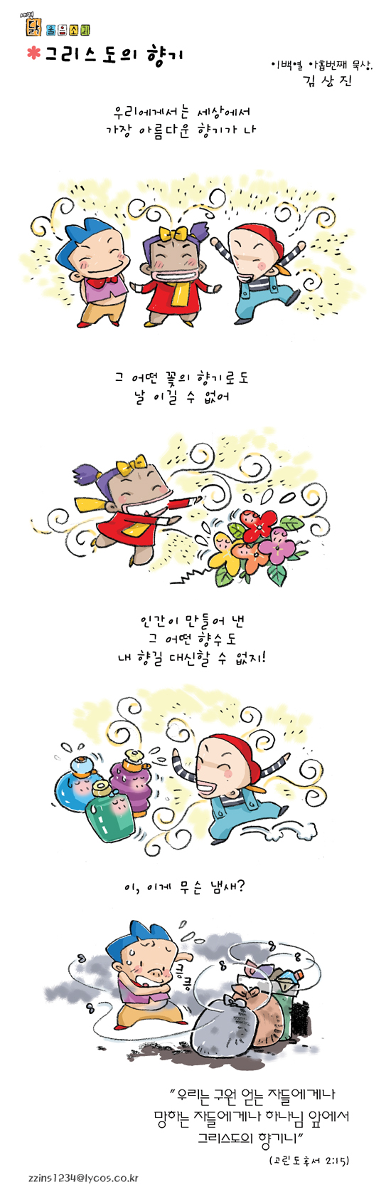 김상진 작가 작품활동 응원하기!지난 20년간 갓피플 만화는 주보 사용을 무료로 제공해왔습니다. 이제는 작가들에게 작은 정성을 표현하면 어떨까요? 주보 1회 사용시 1,000원의 자발적 결제 후 이용해주세요주보사용 자발적 결제1,000원작가에게 커피 한잔선물하기좋아요아멘개척교회 돕기 2006-10-04 · 10204 · 22 · 향기닭 울음소리_김상진더보기성경여행-6편빚과 몫길