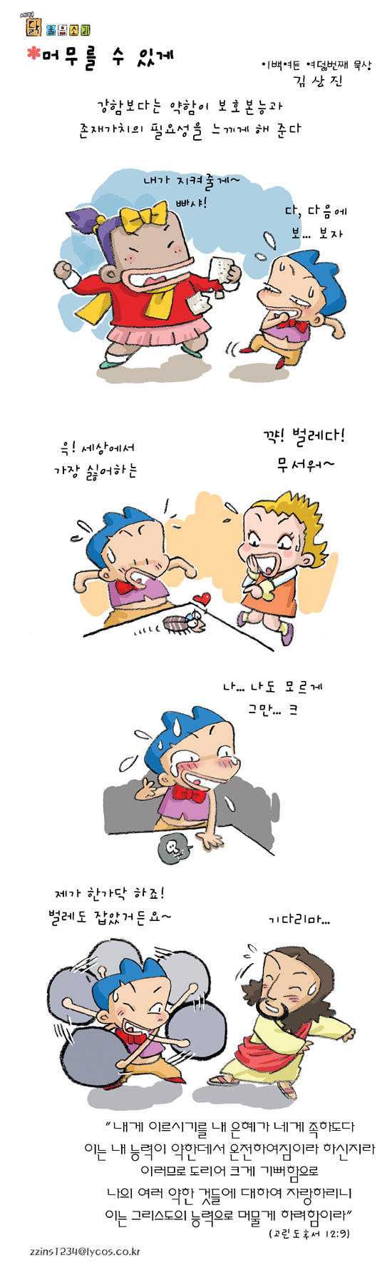 김상진 작가 작품활동 응원하기!지난 20년간 갓피플 만화는 주보 사용을 무료로 제공해왔습니다. 이제는 작가들에게 작은 정성을 표현하면 어떨까요? 주보 1회 사용시 1,000원의 자발적 결제 후 이용해주세요주보사용 자발적 결제1,000원작가에게 커피 한잔선물하기좋아요아멘개척교회 돕기 2007-01-25 · 5269 · 22 · 약함닭 울음소리_김상진더보기성경여행-6편빚과 몫길