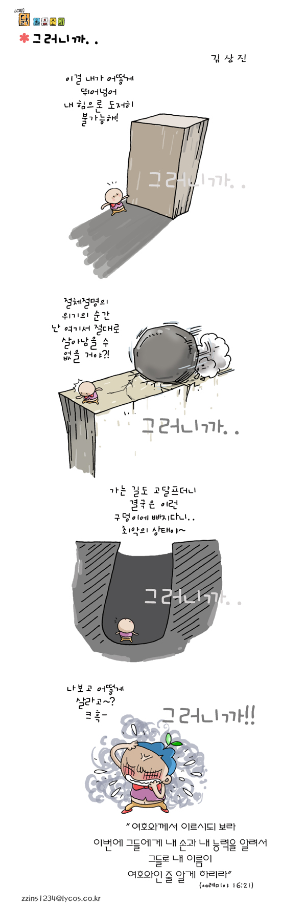 김상진 작가 작품활동 응원하기!지난 20년간 갓피플 만화는 주보 사용을 무료로 제공해왔습니다. 이제는 작가들에게 작은 정성을 표현하면 어떨까요? 주보 1회 사용시 1,000원의 자발적 결제 후 이용해주세요주보사용 자발적 결제1,000원작가에게 커피 한잔선물하기좋아요아멘개척교회 돕기 2009-04-15 · 9965 · 22 · 불가능닭 울음소리_김상진더보기성경여행-6편빚과 몫길