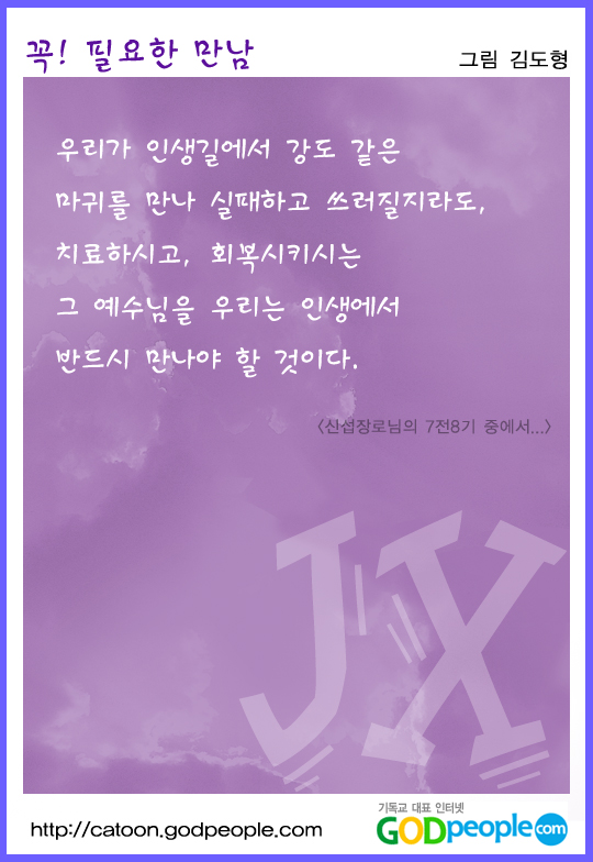 김도형 작가 작품활동 응원하기!지난 20년간 갓피플 만화는 주보 사용을 무료로 제공해왔습니다. 이제는 작가들에게 작은 정성을 표현하면 어떨까요? 주보 1회 사용시 1,000원의 자발적 결제 후 이용해주세요주보사용 자발적 결제1,000원작가에게 커피 한잔선물하기좋아요아멘개척교회 돕기 2006-12-30 · 8129 · 22 · I♡J 보그미_김도형더보기흔들리는 나...문제...^^실패와 만남