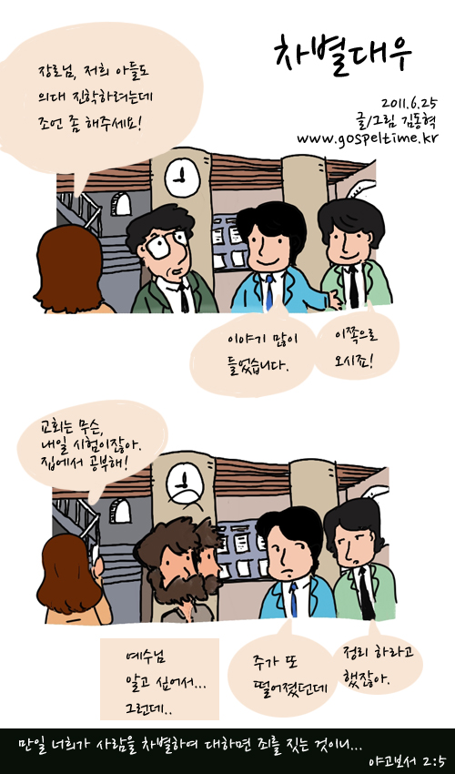 하여 대하지 말라 만일 너희 회당에 금 가락지를 끼고 아름다운 옷을 입은 사람이 들어오고
