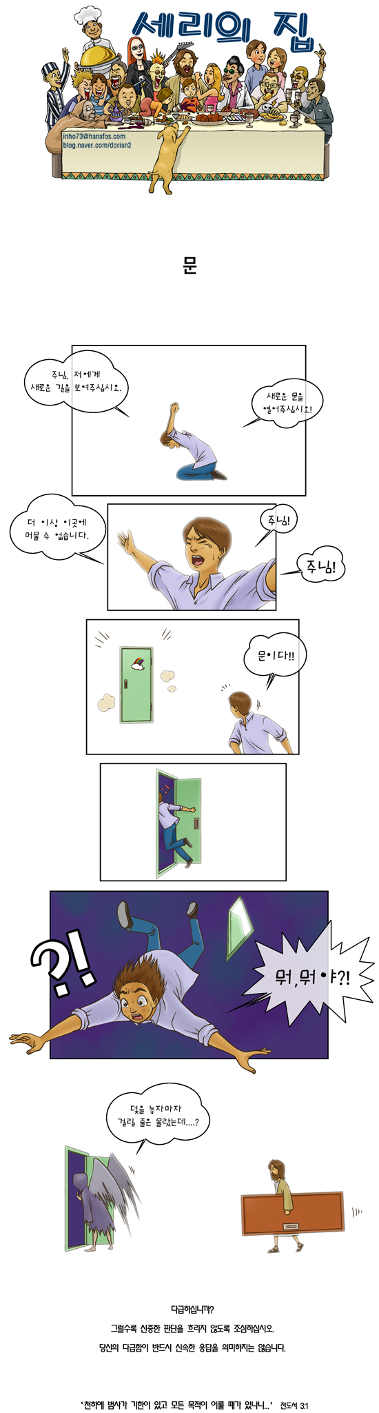 황인호 작가 작품활동 응원하기!지난 20년간 갓피플 만화는 주보 사용을 무료로 제공해왔습니다. 이제는 작가들에게 작은 정성을 표현하면 어떨까요? 주보 1회 사용시 1,000원의 자발적 결제 후 이용해주세요주보사용 자발적 결제1,000원작가에게 커피 한잔선물하기좋아요아멘개척교회 돕기 2005-01-08 · 3363 · 22 · 회심세리의 집_황인호더보기믿음의 힘영적 전쟁미션:임파서블