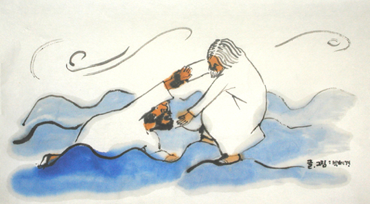 오라 하시니 베드로가 배에서 내려 물 위로 걸어서 예수께로 가되