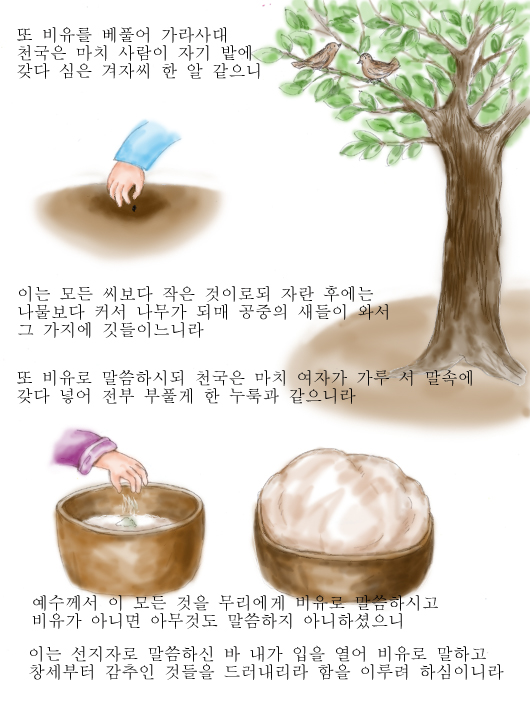 겨자씨와 누룩은 작은 것을 상징하며 그 작은 것이 커져서 다른 것들에 영향을 미치는 존재가 된다는 비유를 말씀해 주십니다. 천국이 이와 같다는 것입니다.