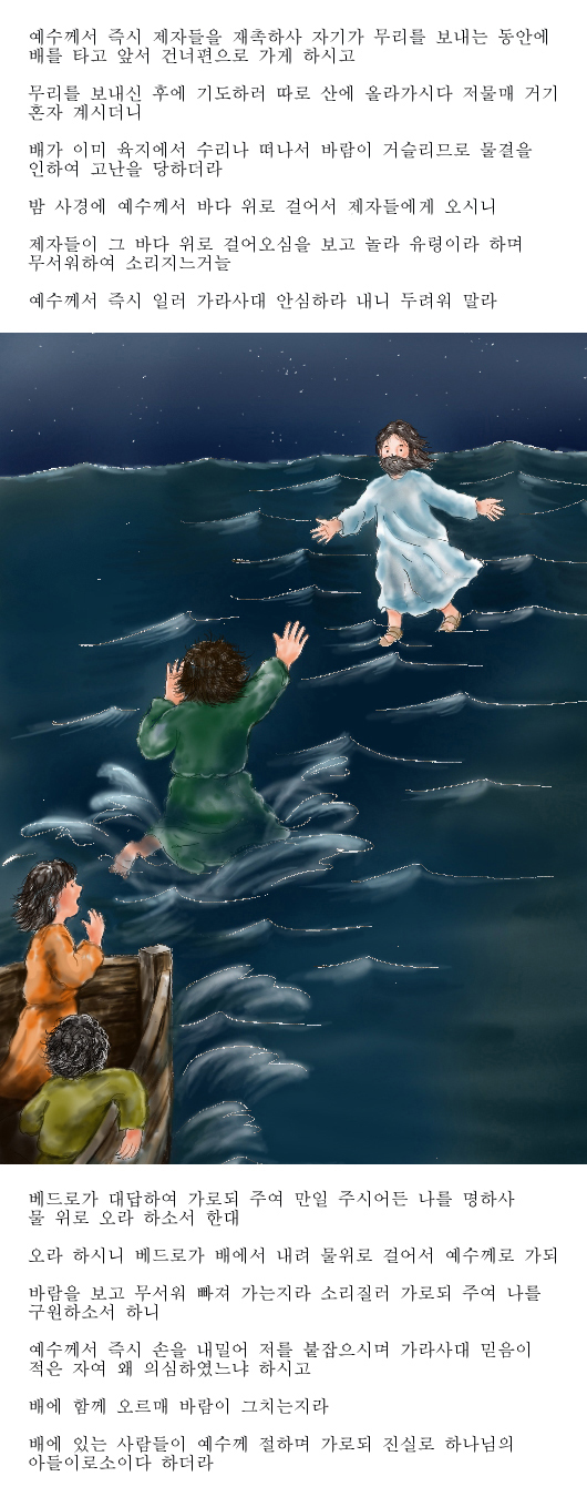 세상이 알 수 없는 기쁨과 확신 가운데 예수님을 바라보며 물위를 걷는 믿음의 걸음을 걷는 하루 하루가 되기를 기도합니다