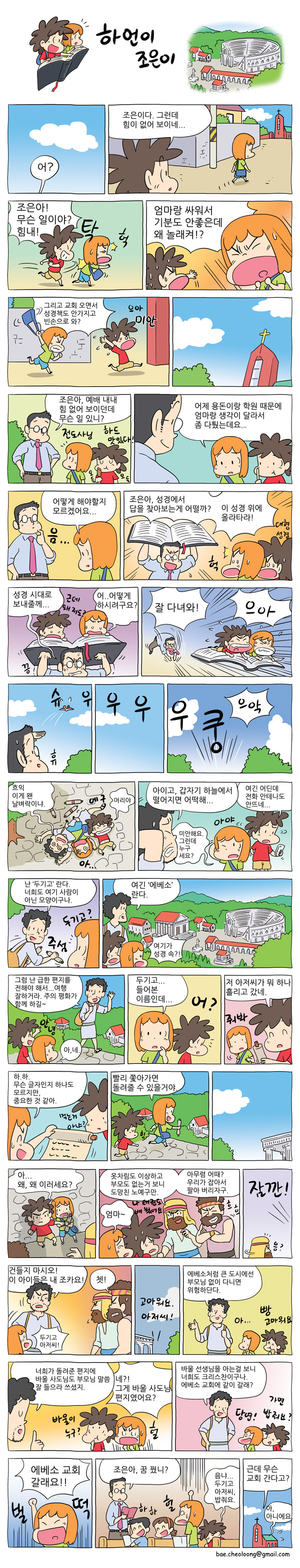 * 이 만화는 어린이 큐티 '스위티'에 실린 작품입니다. 배철웅 작가 작품활동 응원하기!지난 20년간 갓피플 만화는 주보 사용을 무료로 제공해왔습니다. 이제는 작가들에게 작은 정성을 표현하면 어떨까요? 주보 1회 사용시 1,000원의 자발적 결제 후 이용해주세요주보사용 자발적 결제1,000원작가에게 커피 한잔선물하기좋아요아멘개척교회 돕기 2017-10-20 · 9233 · 22 · 2바울부모성경에베소두기고Cartoon Acts_배철웅더보기[카툰액츠]#41[카툰액츠#36]화이팅[효나 하임#50]초대