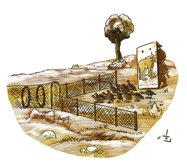 넓은 판에 소를 그려놓고 그 뒤에 숨어서 새들의 모습을