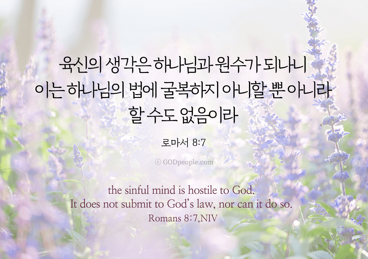 육신의 생각은 하나님과 원수가 되나니 이는 하나님의 법에 굴복하지 아니할 뿐 아니라 할 수도 없음이라 _로마서 8: 7The mind governed by the flesh is hostile to God; it does not submit to God's law, nor can it do so. _Romans 8: 7_NIV ♥ 교도소 재소자에게 성경책을 보내드립니다. [플로잉전용상품] 재소자에게 성경책 보내기_우리말성경 단본(실버그린)우리말성경 단본 (무색인/무지퍼/페이퍼백/실버그린/DKV2406)두란노 편집부 [플로잉전용상품] 재소자에게 성경책 보내기_큰글로 읽는 우리말 비전성경 중단본(호박색)큰글로 읽는 우리말 비전성경 중단본(색인/무지퍼/PU/호박색/DKV2206)도서출판 두란노두란노 편집부 위 성경책을 구매 (플로잉 Flowing) 하시면 "프리즌 리바이벌 PRISON REVIVAL "을 통해서 국내 교정기관의 담장 안에서 지내시는 분들에게 전달됩니다.♥ 수용자 자녀에게 성경만화, 묵상365를 보내드립니다. [플로잉전용상품] 수용자 자녀에게 성경만화 보내기_만화 예수님의 생애 세트 (전3권)온 가족이 함께 보는 사복음서김동순 [플로잉전용상품] 수용자 자녀에게 성경만화 보내기_[개역개정판] 카툰성경 세트(완간/전3권)그린이 : 키이스 닐리, 데이비드 마일즈 [플로잉전용상품] 갓피플 통해 쌀 보내기_백미 (10kg)오픈스토리 [플로잉전용상품] 맛있는 반찬보내기_김치세트 (유기농백김치+겉절이)참식품주식회사 위 상품 구매 (플로잉 Flowing) 하시면 "세움"을 통해서 수용자(교도소 재소자) 자녀들에게 전달됩니다.+오늘의말씀으로 만들었어요♡ 오늘의말씀 아크릴 자석액자+말씀을 듣고 필사하세요♡ 개역개정 MP3 다운로드 | 태블릿으로 필사 | 종이노트로 필사 좋아요아멘개척교회 돕기 2023-04-24 · 3517 · 265 · 15오늘의말씀 말씀카드 로마서8장7절 전도오늘의말씀더보기갓피플 오늘의말씀_에스겔36장36절갓피플 오늘의말씀_갈라디아서4장18절갓피플 오늘의말씀_누가복음6장23절