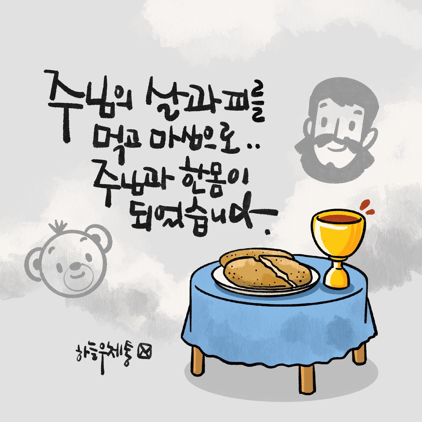 그들이 먹을 때에 예수께서 떡을 가지사 축복하시고 떼어 제자들에게 주시며 이르시되 받아서 먹으라 이것은 내 몸이니라 하시고 또 잔을 가지사 감사 기도 하시고 그들에게 주시며 이르시되 너희가 다 이것을 마시라 이것은 죄 사함을 얻게 하려고 많은 사람을 위하여 흘리는 바 나의 피 곧 언약의 피니라 (마26:26-28)