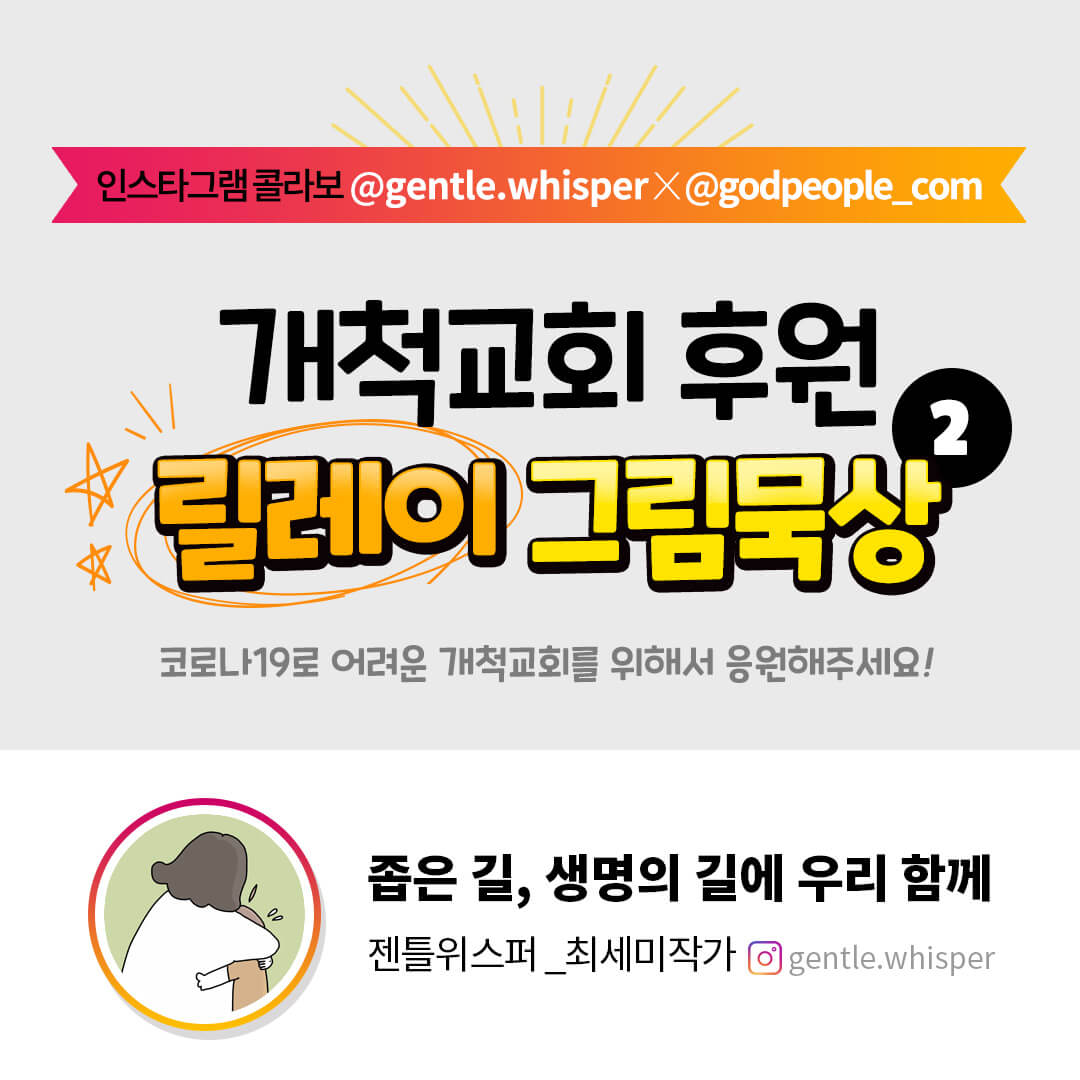 갓피플은 코로나로 어려운 개척교회 목회자를 돕기 위해 2020년 11월 25일 부터 개척교회 후원 릴레이 그림묵상을 진행하였고, 이후 개척교회 후원 사역을 계속 이어가고 있습니다.