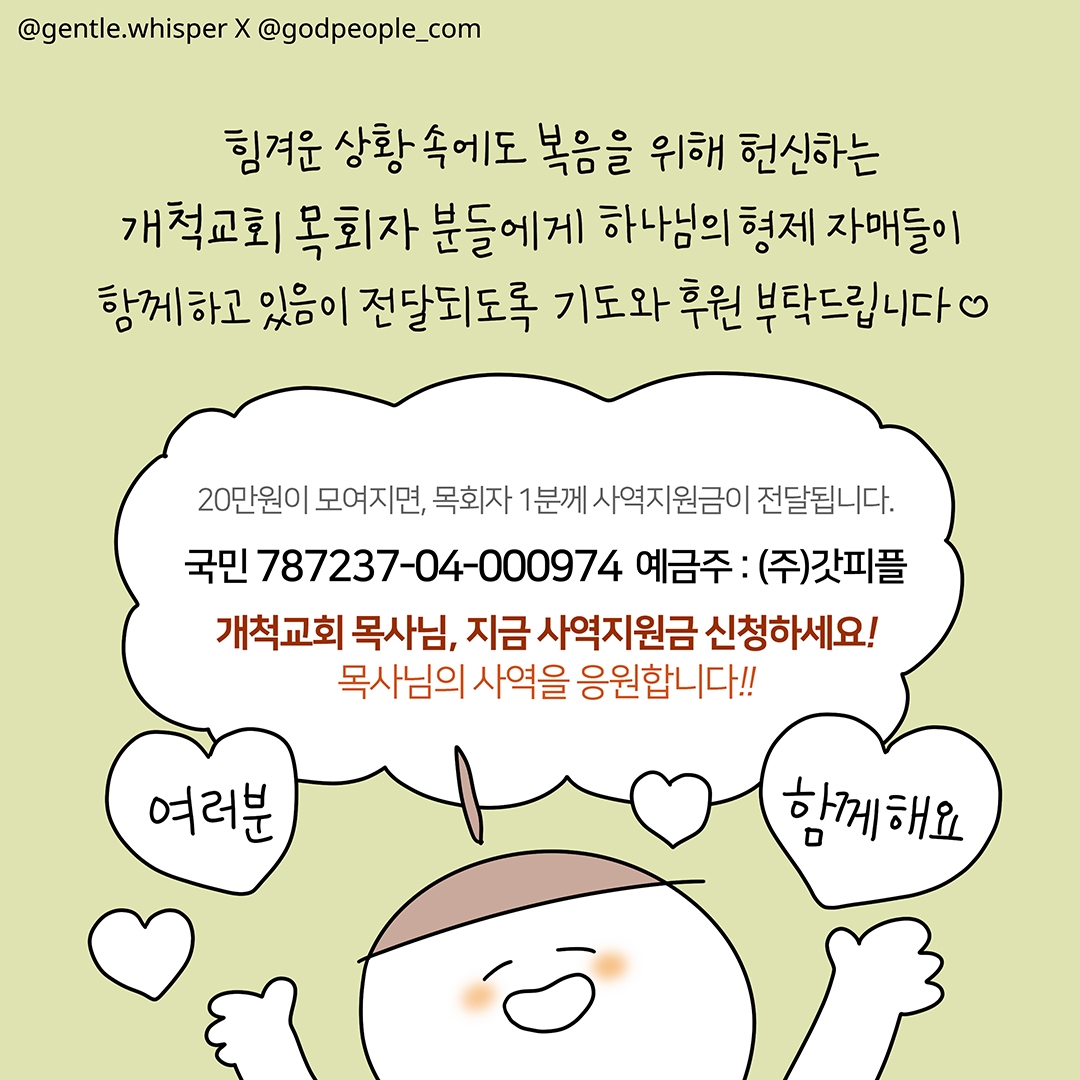 20만원의 후원금이 모여지면, 목회자 1분께 사역지원금이 전달됩니다.
