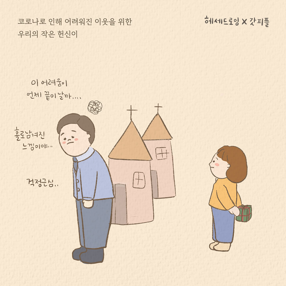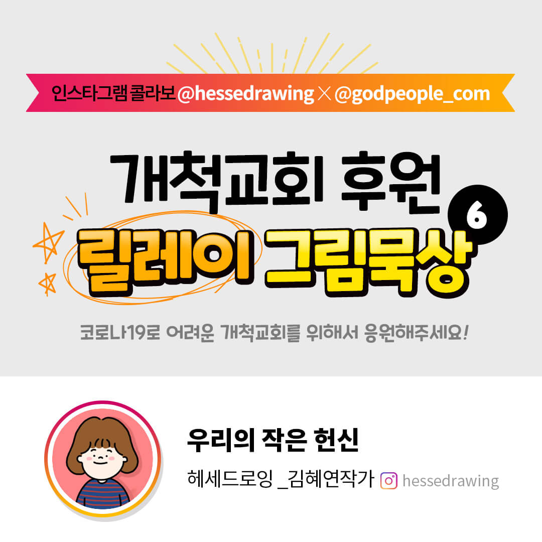갓피플은 코로나로 어려운 개척교회 목회자를 돕기 위해 2020년 11월 25일 부터 2021년 8월 3일까지 개척교회 후원 릴레이 그림묵상을 진행하였습니다.