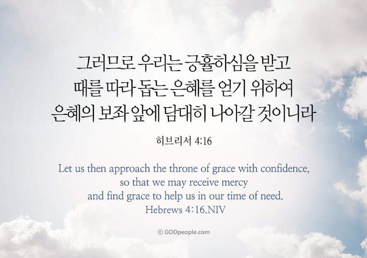 그러므로 우리는 긍휼하심을 받고 때를 따라 돕는 은혜를 얻기 위하여 은혜의 보좌 앞에 담대히 나아갈 것이니라 _히브리서 4:16