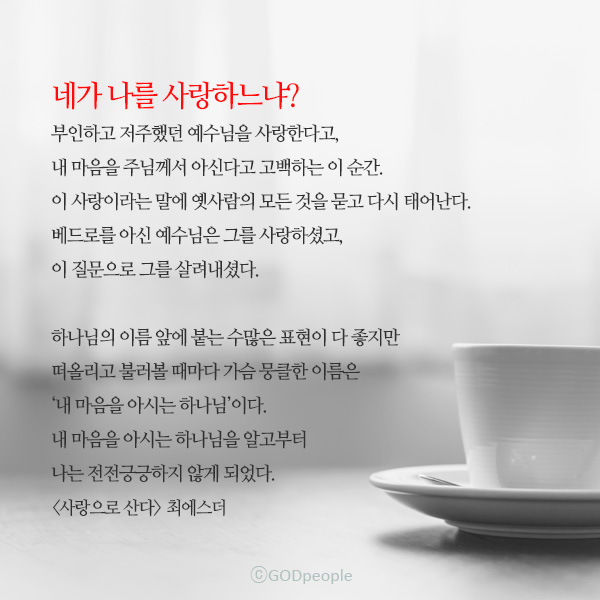 부인하고 저주했던 예수님을 사랑한다고, 내 마음을 주님께서 아신다고 고백하는 이 순간. 이 사랑이라는 말에 그는 다시 태어난다. 베드로를 아신 예수님은 그를 사랑하셨고, 이 질문으로 그를 살려내셨다.