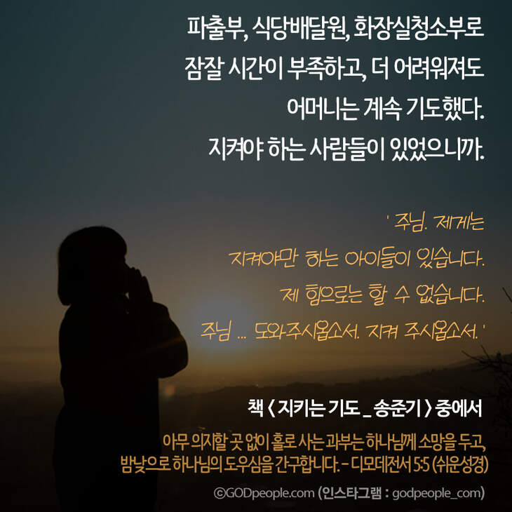죽을 것 같은 생활고와 살려야 하는 자식들 때문이었다. 잠을 조금 더 자기보다, 기도를 선택한 이유는 대단한 영성 때문이 아니었다.