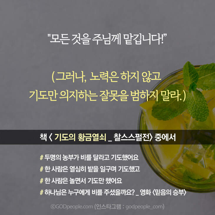 노력은 하지 않고 "모든 것을 하나님께 맡깁니다!”라고 말하는 그리스도인들은 경험과 지혜로 전하는 이 말을 경청해야 할 것이다.