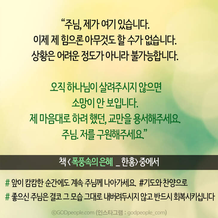 오직 하나님이 살려주시지 않으면 소망이 안 보입니다. 저의 교만을 용서해주세요. 저를 구원해주세요.”