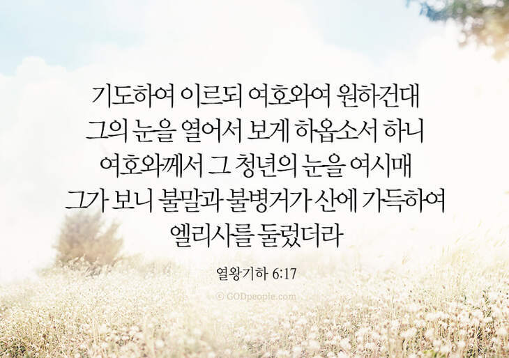 기도하여 이르되 여호와여 원하건대 그의 눈을 열어서 보게 하옵소서 하니 여호와께서 그 청년의 눈을 여시매 그가 보니 불말과 불병거가 산에 가득하여 엘리사를 둘렀더라 _열왕기하 6:17