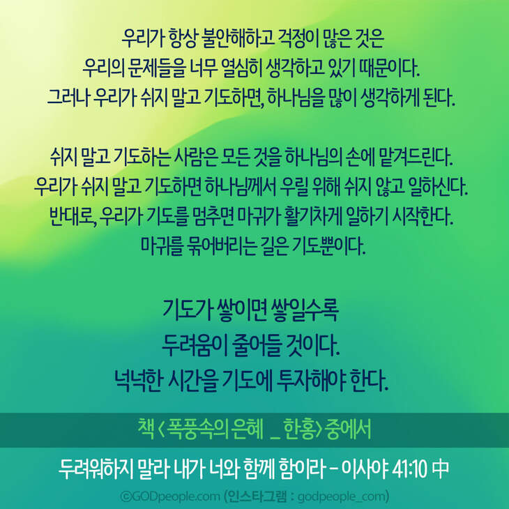 우리가 항상 불안해하고 걱정이 많은 것은 우리의 문제들을 너무 열심히 생각하고 있기 때문이다. 그러나 우리가 쉬지 말고 기도하면 하나님을 많이 생각하게 된다.