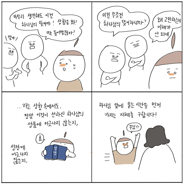 하나님께 오지 않은 생각들을 예수 이름으로 끊어내며, 어떤 상황에도 하나님 편에 서는 우리 되기를 축복합니다.