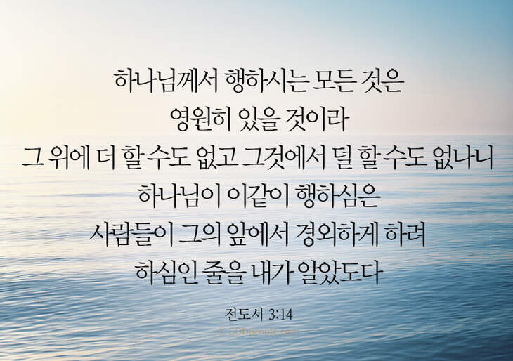 하나님께서 행하시는 모든 것은 영원히 있을 것이라 그 위에 더 할 수도 없고 그것에서 덜 할 수도 없나니 하나님이 이같이 행하심은 사람들이 그의 앞에서 경외하게 하려 하심인 줄을 내가 알았도다 _전도서 3:14
