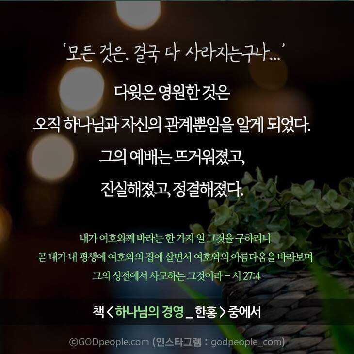하나님 외에 바라볼 수 있는 것은 다 없어져 버렸기 때문에, 다른 데 시선이 분산되지 않았다. 오직 주님께 집중하는 예배자로 거듭나게 되었다.