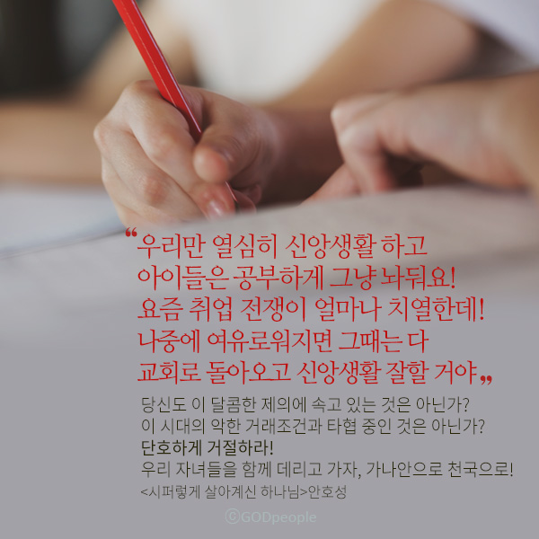 “너희만 열심히 신앙생활 해! 네 자녀들은 공부하게 그냥 놔둬! 요즘 취업 전쟁이 얼마나 치열한데! 나중에 여유로워지면 그때는 다 교회로 돌아오고 신앙생활 잘할 거야.”