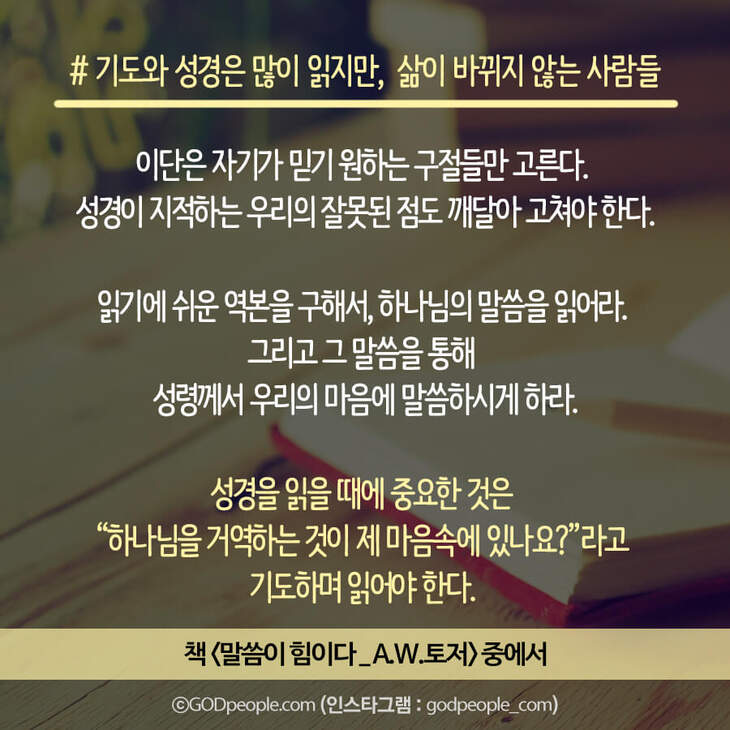 주변을 둘러보면 성경의 역본들이 너무 많은 것 아닌가 하는 생각도 들 것이다. 하지만 역본들이 많다고 해서 질리거나 위축되지 말라. 읽기에 쉬운 역본을 구해서 하나님의 말씀을 읽어라. 그리고 그 말씀을 통해 성령께서 우리의 마음에 말씀하시게 하라.
