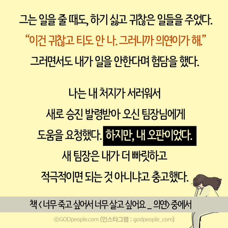 사람들은 내 앞에서는 과장을 욕하고, 과장 앞에서는 나를 욕했다. 그들은 내가 솔직히 말하는 것을 좋아했다. 그래야 선후임이 싸우고 막장으로 치닫는 자극적인 소문이 생기니까. 그래야 그들이 키득거리며 술안주 삼아 씹을거리가 생기기에,