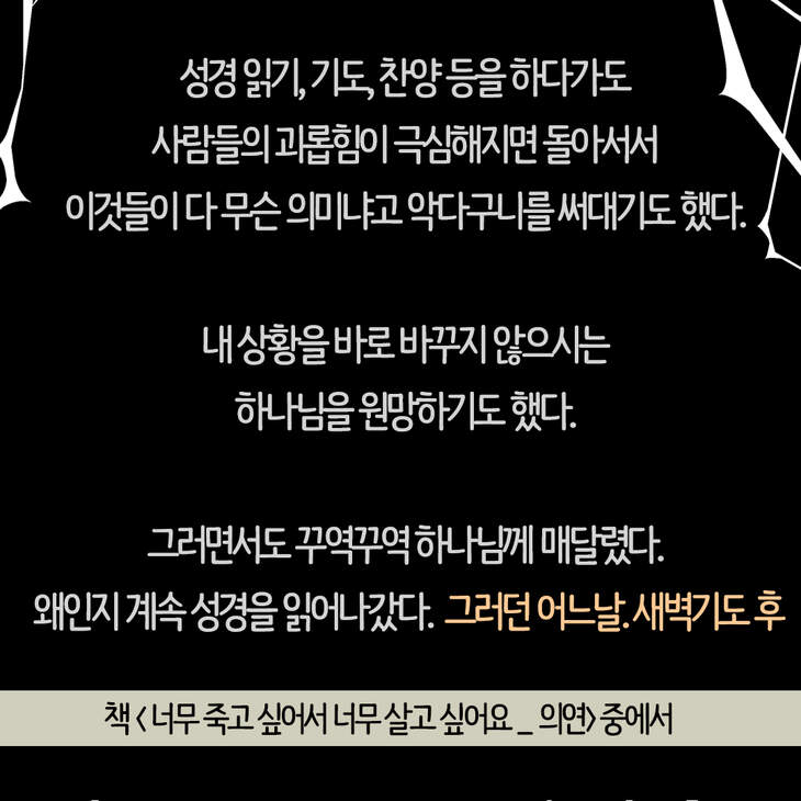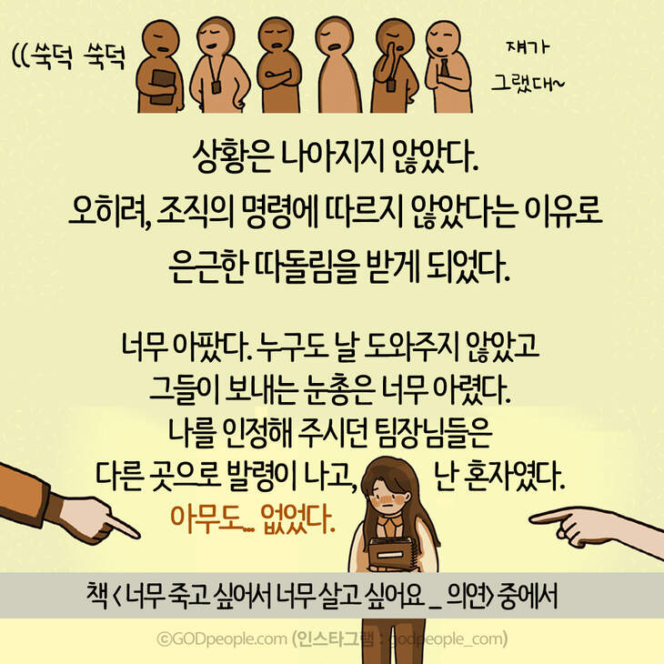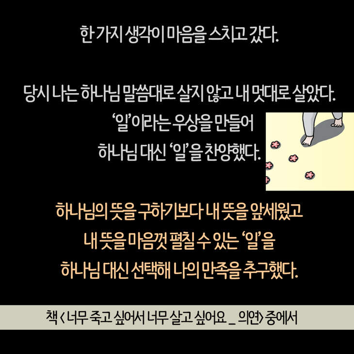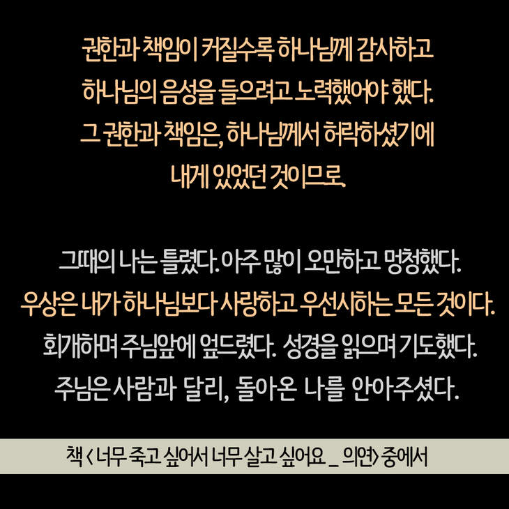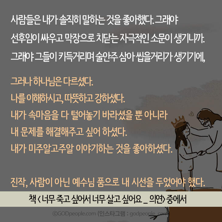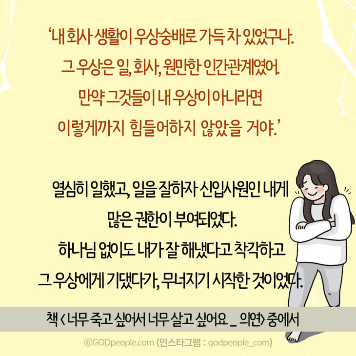 관계가 힘들고 일이 어려울 때면 가장 먼저 선배와 동기가 떠올랐다. 하나님이 아니었다. 하나님의 딸이라 자부하면서 그분의 지혜가 아니라 세상 지식을 구했다. 그럴수록 일은 더 꼬였고 관계도 더 어려워졌다. 너무나 괴로웠다.