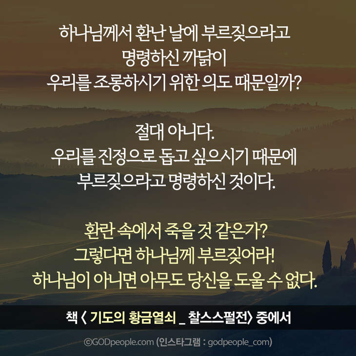 역경에 처하거든 하나님께 부르짖어라. 그러면 고통을 알지 못했을 때보다 당신의 영혼을 훨씬 더 풍요롭고 강건하게 해줄 놀랍고도 달콤한 구원을 체험하게 될 것이다.