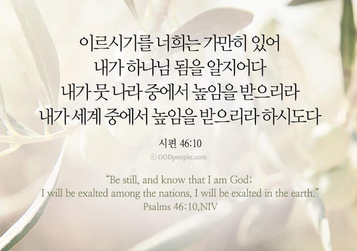 이르시기를 너희는 가만히 있어 내가 하나님 됨을 알지어다 내가 뭇 나라 중에서 높임을 받으리라 내가 세계 중에서 높임을 받으리라 하시도다 _시편 46:10