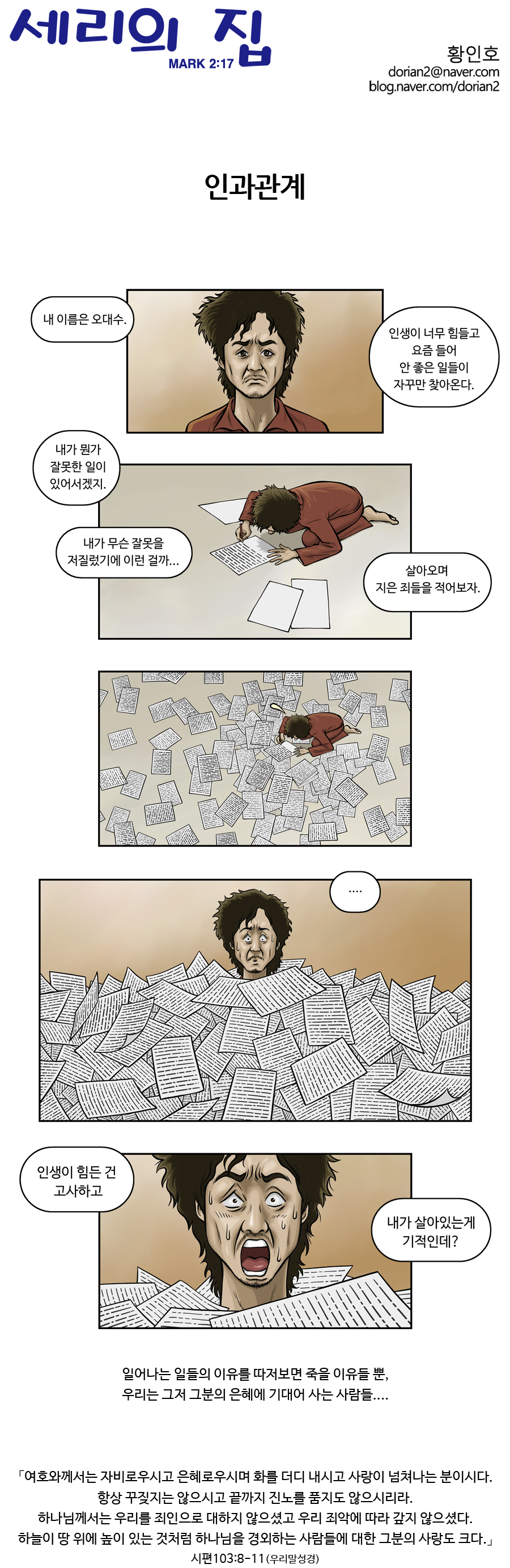 황인호 블로그 https://blog.naver.com/dorian2황인호 작가 작품활동 응원하기!지난 20년간 갓피플 만화는 주보 사용을 무료로 제공해왔습니다. 이제는 작가들에게 작은 정성을 표현하면 어떨까요? 주보 1회 사용시 1,000원의 자발적 결제 후 이용해주세요주보사용 자발적 결제1,000원작가에게 커피 한잔선물하기좋아요아멘개척교회 돕기 2024-06-05 · 1334 · 7 · 8은혜사랑용서세리의 집_황인호더보기믿음의 힘영적 전쟁미션:임파서블