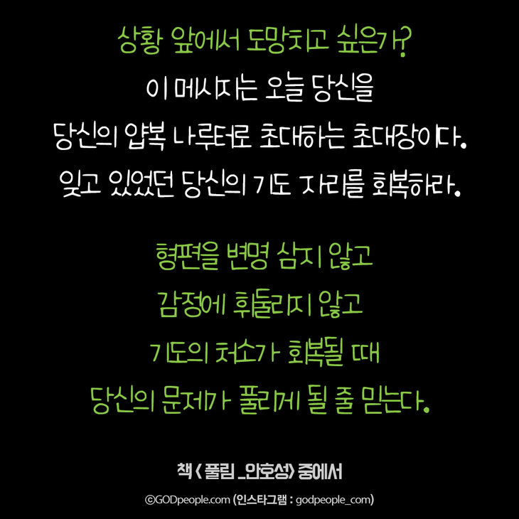 크리스천 생활을 풍성하게 하는 #크리스천굿즈 https://gp.godpeople.com/archives/111392 * 갓피플 인스타 : 인스타에서도 갓피플을 만날 수 있어요! (팔로잉~)▶ http://www.instagram.com/godpeople_com좋아요아멘개척교회 돕기 2021-02-02 · 5180 · 221 · 2기도위험위기야곱갓피플인스타인스타안호성에서풀림갓피플 인스타더보기그렇게 준비하고 헌신했는데,,,그의 인생은 허무하게 끝난 것처럼 보였습니다. 그러나결혼에서 매우 중요한 부분! 기억하세요.내 생각이 너무 강해서, 주님의 사인도 못 알아들으면 어떡해요?