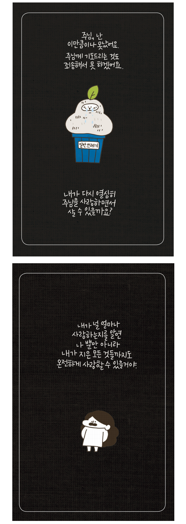 주님. 저의 모습을 보면 못난 모습 뿐이에요. 하지만 이런 저의 모습도 주님은 받아준다고 하시네요. 주님의 완전한 사랑, 큰 사랑에 감사드려요. 주님이 저를 얼마나 사랑하시는지 매순간 알아가게 해주세요. 그리고 받은 그 사랑을 사람들에게, 주님께 다시 돌려드리겠어요.