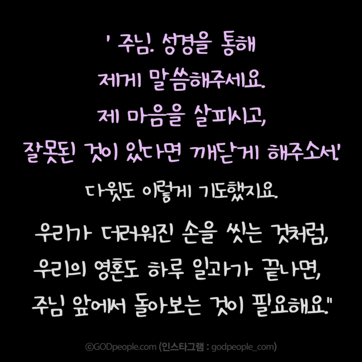 오늘부터 이 기도를 해보세요. 정말 강건해지실 거예요. 그리고 성품도 성숙해지기 시작하고요. 우리를 정죄하지 않으시고, 구원하시기 원하시는 주님께 마음을 살펴달라고 기도하고요.