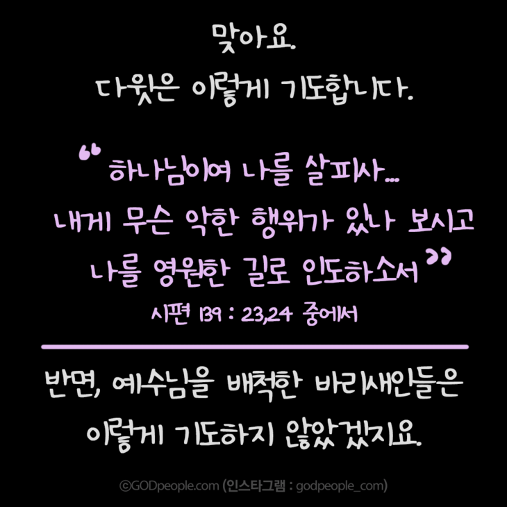 기도를 가로막는 것이 바로 죄라고 말해요. 우리는 은근 '나는 꽤 괜찮은 사람'이라고 생각하지만, 자신이 못 보는 사각지대가 있는 것 같아요.