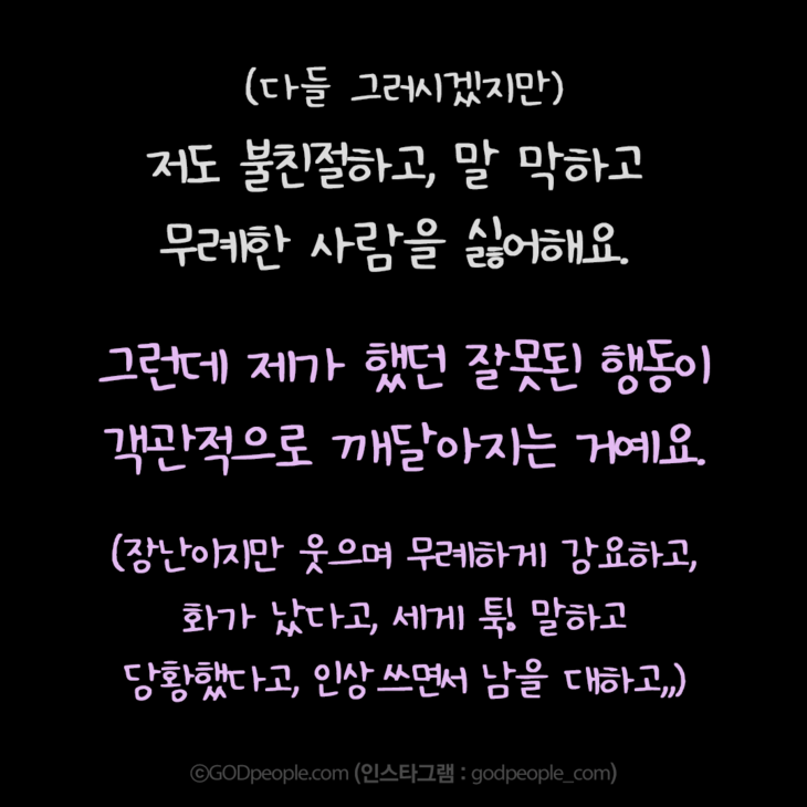 보통 예전 일이 생각나도, 자기객관화가 안되잖아요. (내 위주로 생각해서, 내 잘못을 모름;;) 그런데, 주님께 그렇게 기도하자, 제 잘못을 사랑 안에서 보여주셔서 얼마나 감사한지요. 진짜. 입틀막했어요.