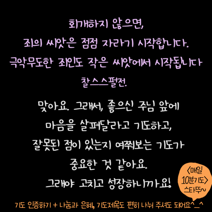 죄는 멈추지 않고, 점점 커져요. 우리를 향한 하나님의 촛대를 옮겨버려요. 그래서 찰스스펄전목사님도 그렇게 말씀하시지요.