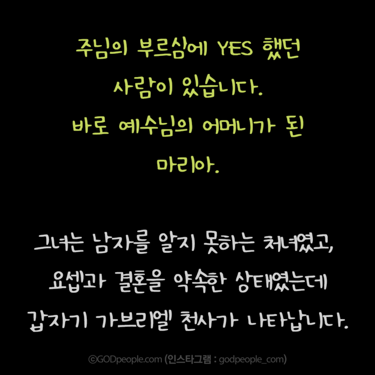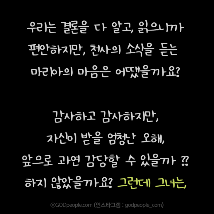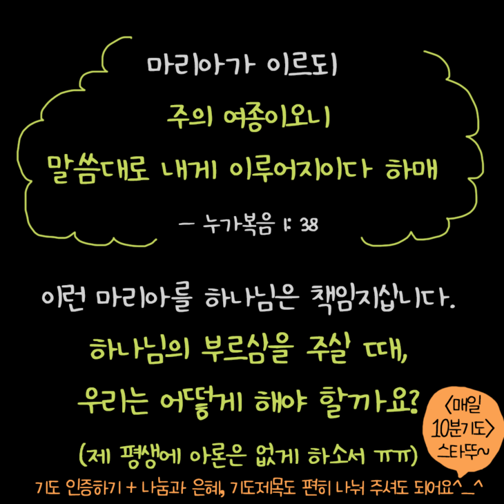또 그 부르심이 왔을 때, 나의 부족함을 생각하며 "못해요!" 하는 것이 아니라, 마리아처럼 이렇게 기도하며 부르심을 취하는 우리 되길 원합니다.